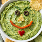 Make it ahead: Press plastic wrap directly onto the surface of the dip to prevent browning. It holds well in the fridge for up to 4 hours. Add the Grinch face decorations right before serving.