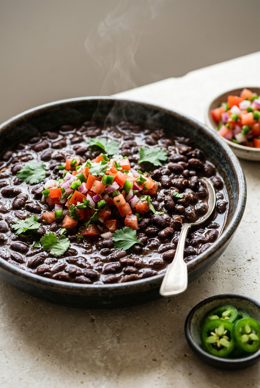Garnishes: The perfect bowl of black beans deserves the right garnishes. I suggest fresh cilantro, crumbled cotija cheese, a squeeze of lime juice, and a dollop of Mexican crema or sour cream.